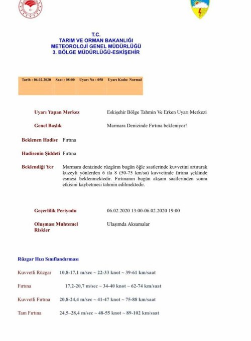 Bursa AFAD, Meteoroloji 3. Bölge Müdürlüğü Eskişehir Bölge Tahmin ve Erken Uyarı Merkezi'nin açıklamalarını paylaştı. Açıklamada, "Marmara Denizinde rüzgarın bugün öğle saatlerinde kuvvetini artırarak kuzeyli yönlerden 6 ila 8 (50-75 km/sa) kuvvetinde fırtına şeklinde esmesi beklenmektedir. Fırtınanın bu akşam saatlerinde sonra etkisini kaybetmesi tahmin edilmektedir" denildi.