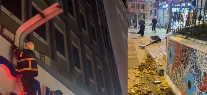 Atatürk Caddesi'nde bir işyerinin üstündeki sac tabela parçası ise az kalsın kazaya yol açacaktı. Polisler emniyet şeridi çevirdi, itfaiye ekipleri ise merdivenle çıkarak sac parçasını söktüler.