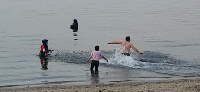 Soğuk havaya aldırış etmeyen aralarında gençler ve çocuklarında olduğu bir aile Güzelyalı'da denize girdi. Soğuğa aldırış etmeden suya atlayıp yüzen aileyi görenler adeta şok oldu.