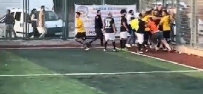 Bursa'nın Osmangazi ilçesinde bir halı sahada organize edilen turnuvada mücadele eden iki takım oyuncuları arasında kavga çıktı. Hakemlerin de dahil olduğu kavga güvenlik kameralarına anbean yansıdı.