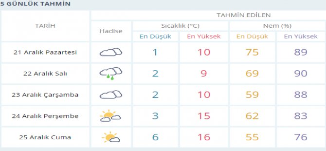 BURSA İÇİN 5 GÜNLÜK HAVA TAHMİNİ