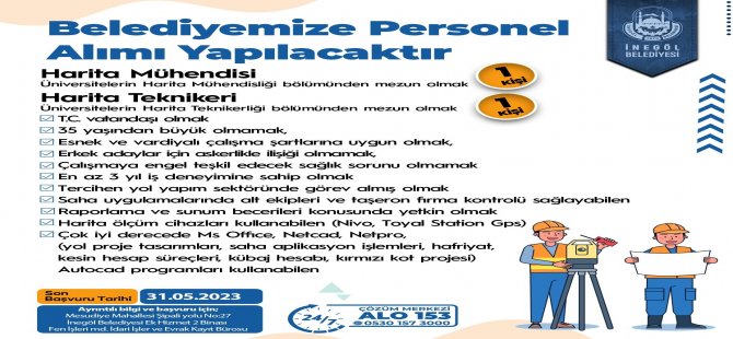 İnegöl Belediyesi, 1 harita mühendisi ve 1 harita teknikeri olmak üzere 2 personel alımı yapılacağını duyurdu. Son başvuru 31 Mayıs 2023 olarak açıklandı.