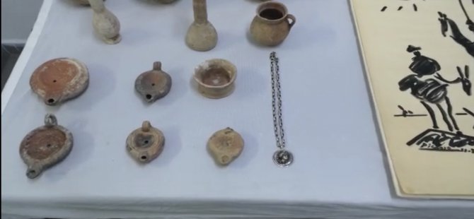 Tarihi eser kaçakçılarıyla buluşan jandarma ekipleri G.G., İ.Ö., M.S.A., H.Y., M.A., S.S. ve G.Y. isimli şüpheli şahısları suçüstü yakaladı. Şahısları gözaltına alan ekipler, 1 adet ünlü ressam Picasso’ya ait olduğu değerlendirilen “Don Kişot” resimli tablo, 3 adet cam gözyaşı şişesi, 2 adet toprak gözyaşı şişesi, 5 adet yağdanlık, 4 adet toprak kase, 1 adet toprak küp, 2 adet cam obje, 2 adet toprak bardak, 1 adet toprak heykel, 1 adet toprak küp, 1 adet 30 cm çapında bayan ve erkek tablo, 1 adet 20 cm çapında metal resimli obje, 1 adet toprak sürahi, 2 adet gözyaşı şişesi kapağı, 1 adet gümüş madalyon, 1 adet madeni para, 1 adet yabancı menşeli kitap, 1 adet tepsili kadeh ele geçirdi. Yakalanan tarihi eser kaçakçıları sorgulanmak üzere karakola götürülürken, olayla ilgili soruşturma devam ediyor.